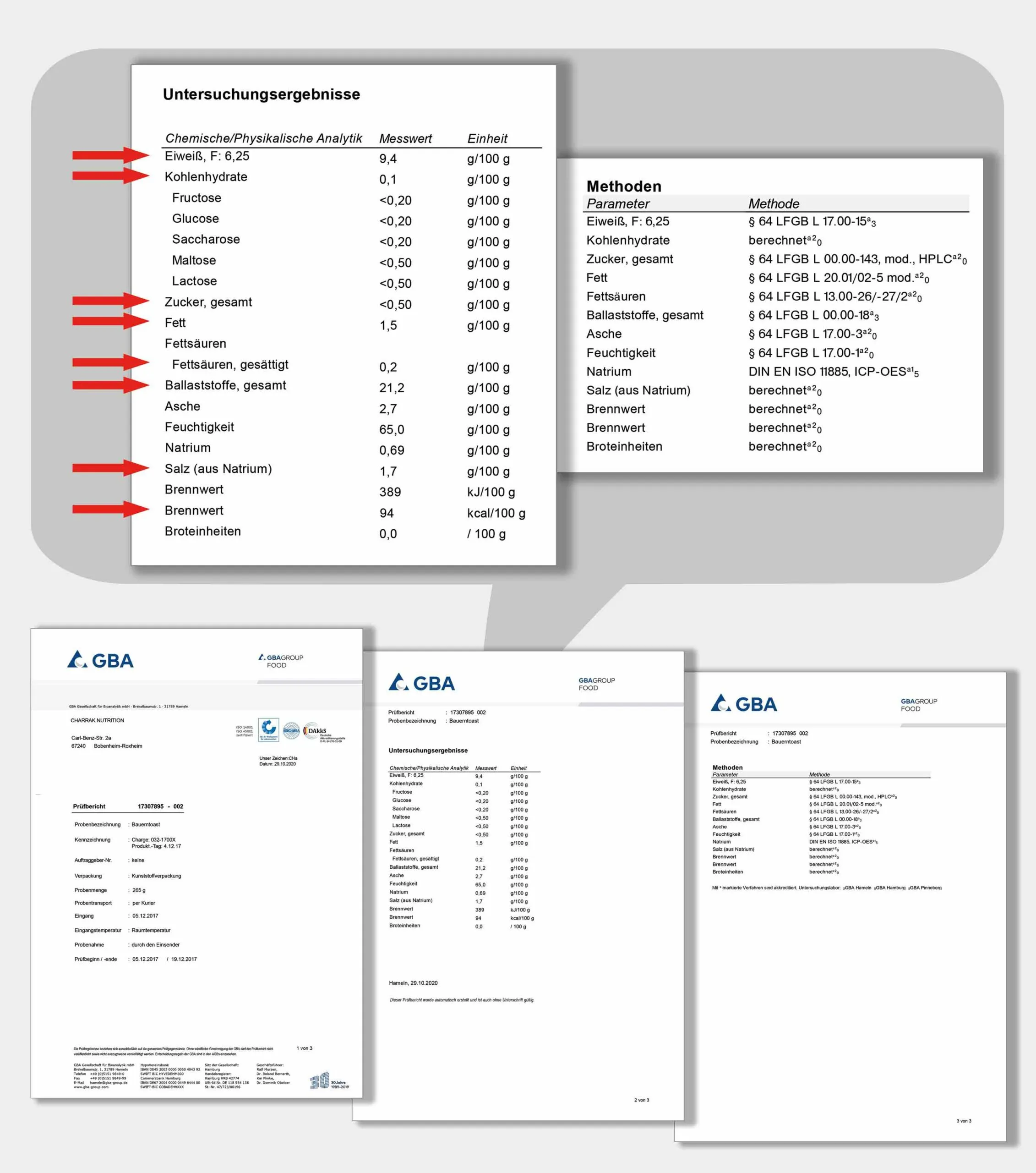 Es gibt aber auch Werte, für die keine spezielle Analyse möglich ist: diese Werte werden berechnet. Dabei handelt es sich um die verwertbaren Kohlenhydrate im Allgemeinen, Natriumchlorid und den Brennwert – also die Kalorien.