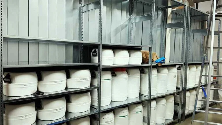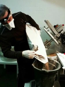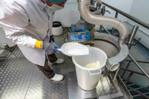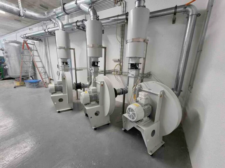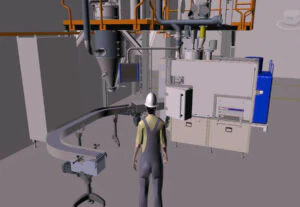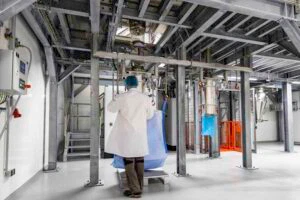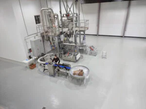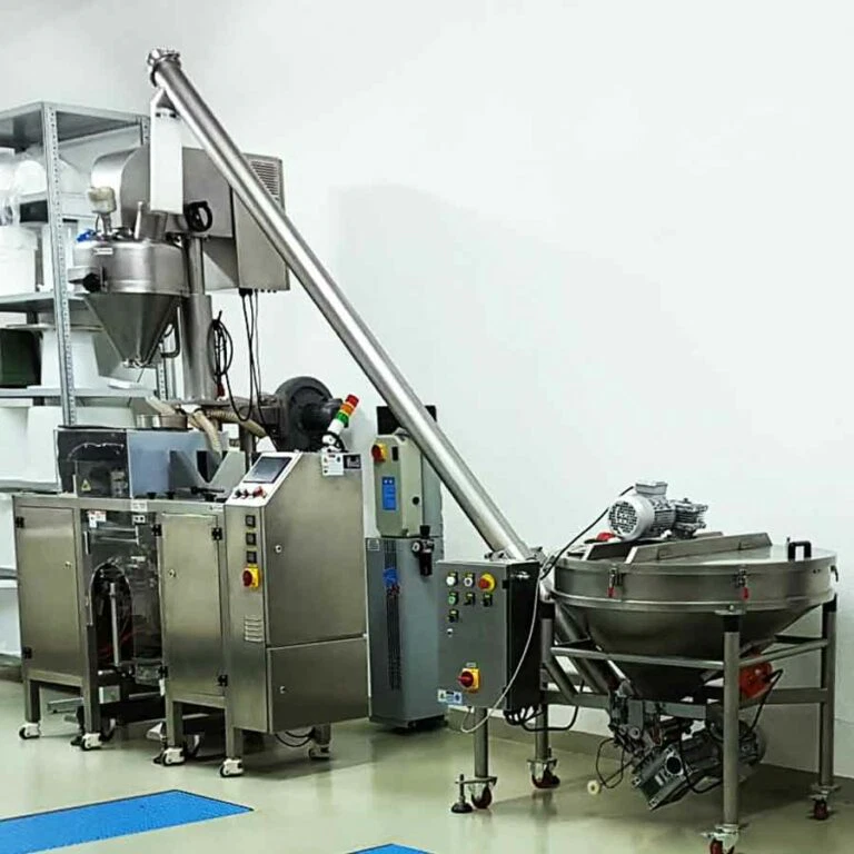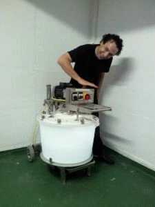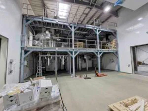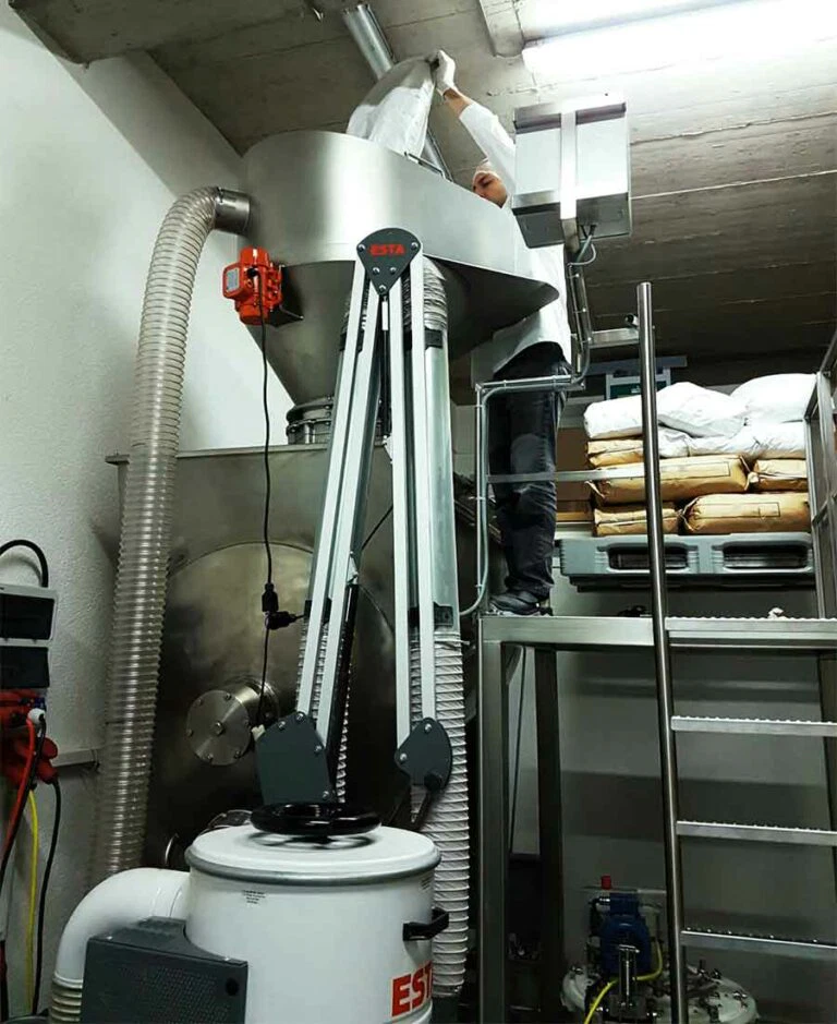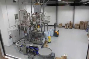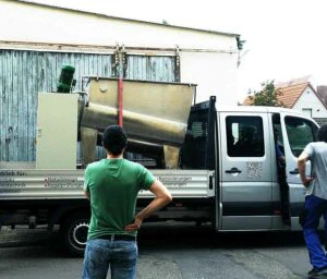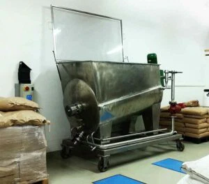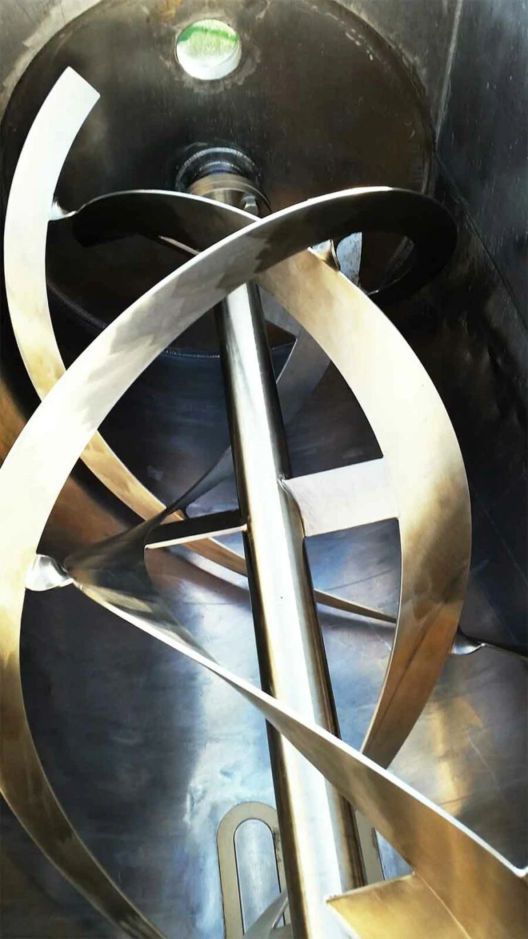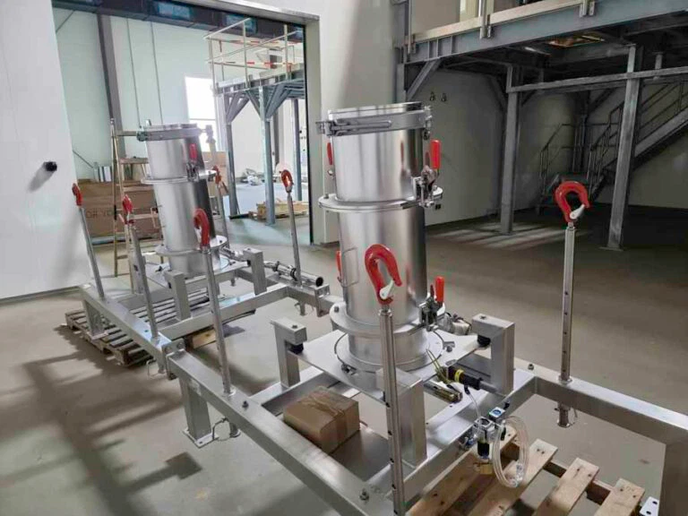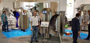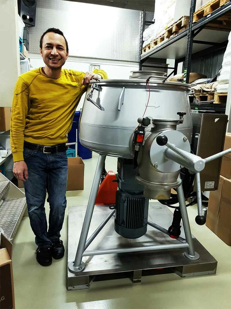Seit über einem Jahr, schon vor dem ersten Spatenstich, hatten wir mit der Anlagenplanung begonnen. Hauptakteure waren die Firma AZO, die sämtliche Komponenten zum Rohstoff- und Pulverhandling lieferten, sowie die Firma AMIXON, aus deren Fertigung unser “Herzstück”, der Lebensmittelmischer stammen sollte.