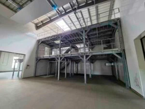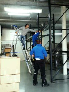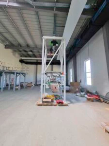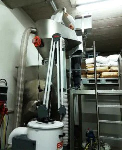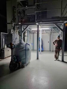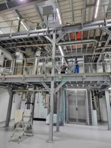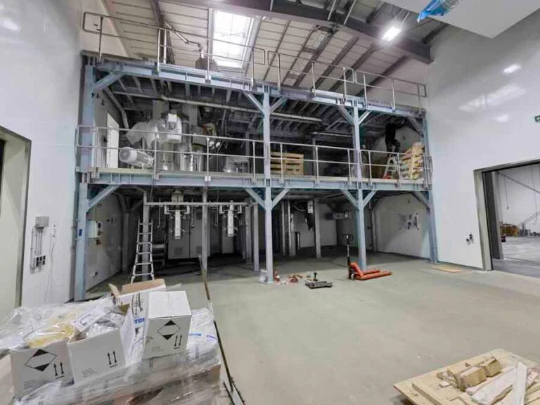 Nachdem die Stahlbühnen aufgebaut waren, begannen die AZO Monteure mit der Installation der Einzelkomponenten: Sackaufgabe- und Siebestationen, BigBag-Befüll- und Entleerstation, Entstaubung für das gesamte Gebäude und die Anbindung an unsere Verpackungsmaschine (das war eine der wenigen Anlagen, die wir aus Bobenheim mitbrachten – alles andere war neu geplant worden).