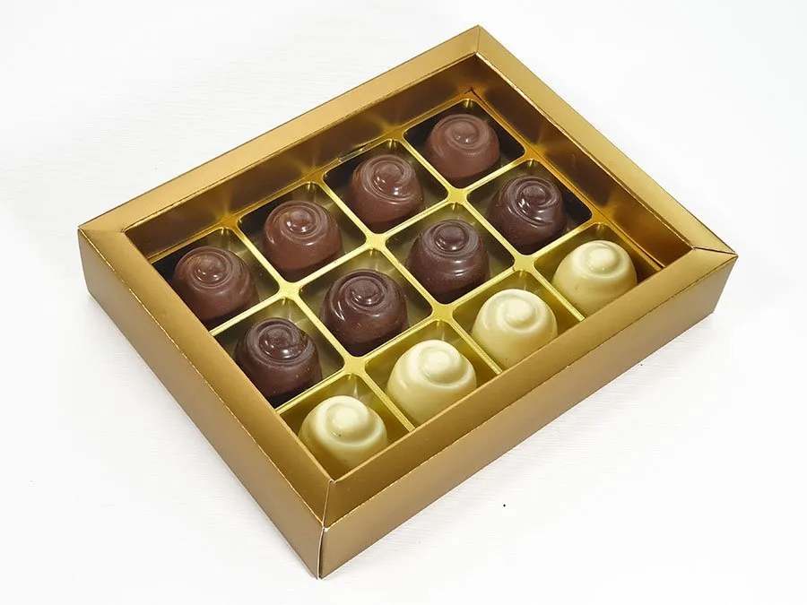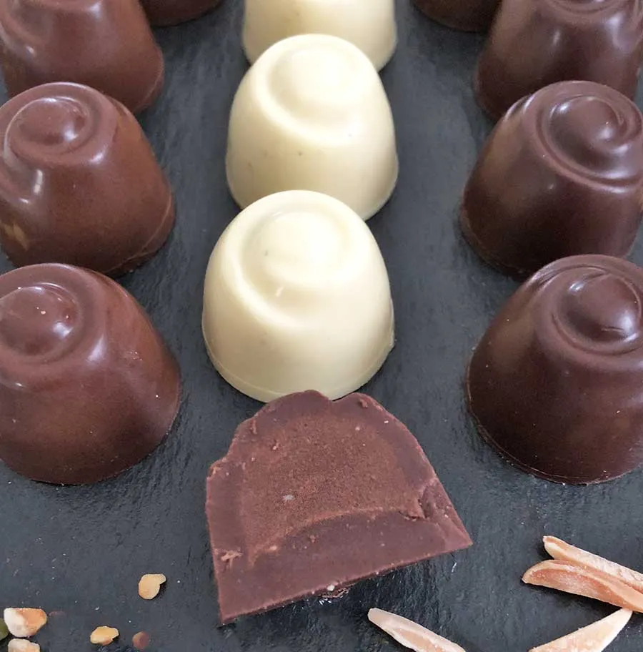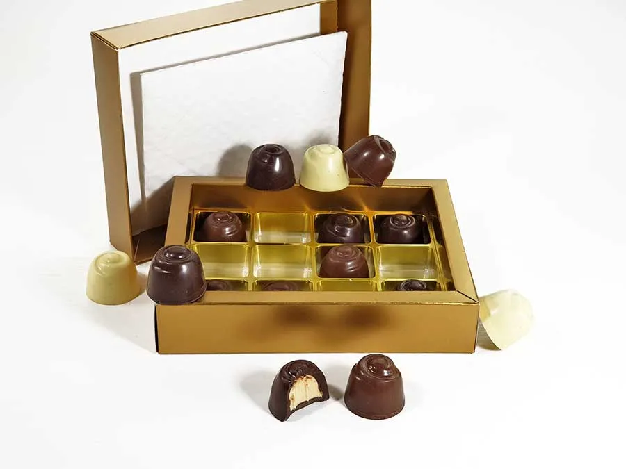- 12 handgemachte, gefüllte Pralinen in 3 köstlichen Sorten