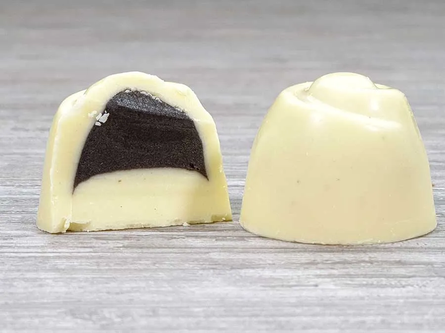 Kohlenhydratreduzierte Zubereitung auf Fettbasis mit Süßungsmitteln, speziell geeignet für eine kohlenhydratreduzierte und ketogene Ernährung (Ketogene Ratio 3.9 : 1): Konfekt mit verschiedenen zartschmelzenden Füllungen. Ein köstlicher schwarz-weisser Mix mit der betörenden Schokoladigkeit unserer Schwarzen Sahne:  Schwarze Sahne & Weisse Sahne-Creme und Weisse Sahne & Schwarze-Sahne-Creme