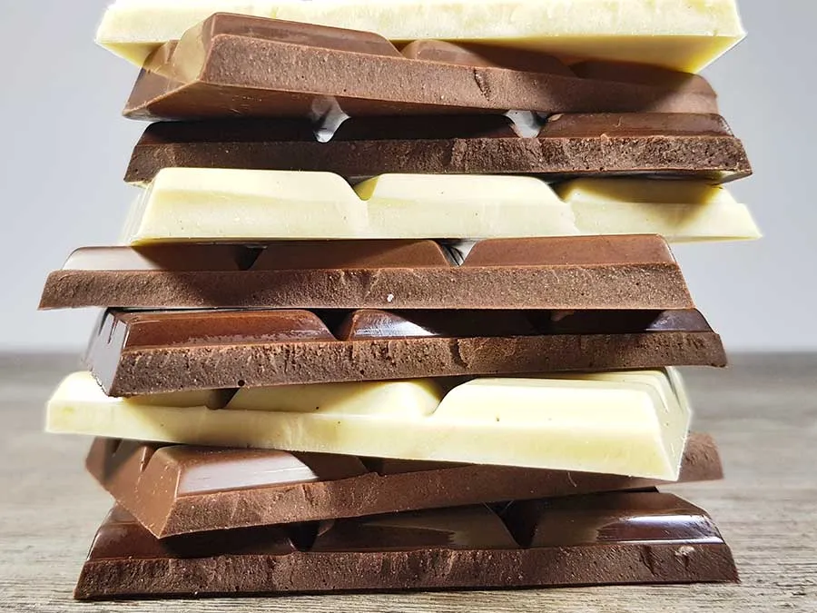 - 3 Sorten Schokolade PUR: 1 x Vollmilch, 1 x Zartbitter, 1 x Weisse Sahne