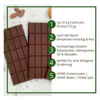 - Vollmundig-kräftige low-carb Zartbitter Schokolade mit aromatischer Kakaonote (vergleichbar mit einer herkömmlichen 50-60%igen Zartbitterschokolade)