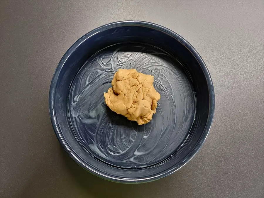 Für eine ideale Teigkonsistenz ist es wichtig, dass die Eier kalt sind (also frisch aus dem Kühlschrank geholt) und die geschmolzene Butter maximal 35 °C hat. Beim Verrühren bildet sich so schnell ein kompakter Teig, der sich leicht vom Schüsselrand löst und nur wenig klebt. Falls der Teig dennoch zu stark klebt, könnt ihr ihm entweder noch einige Zeit im Kühlschrank gönnen, oder ihr rollte den Boden einfach mit Hilfe eines Stücks Frischhaltefolie aus.