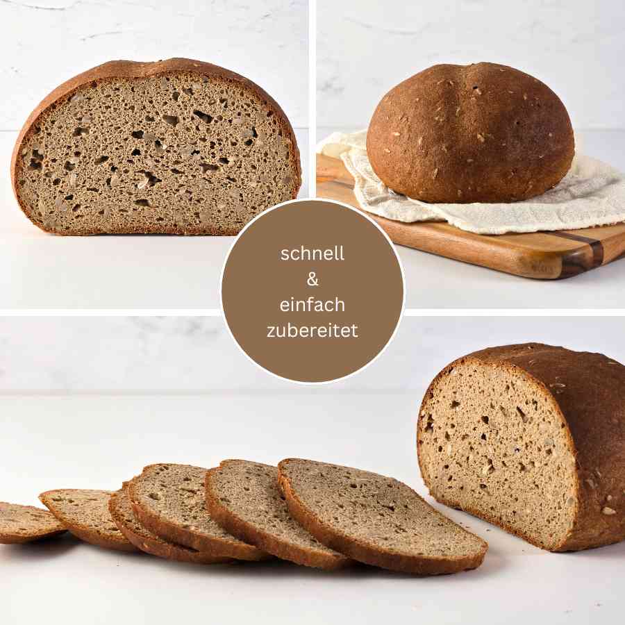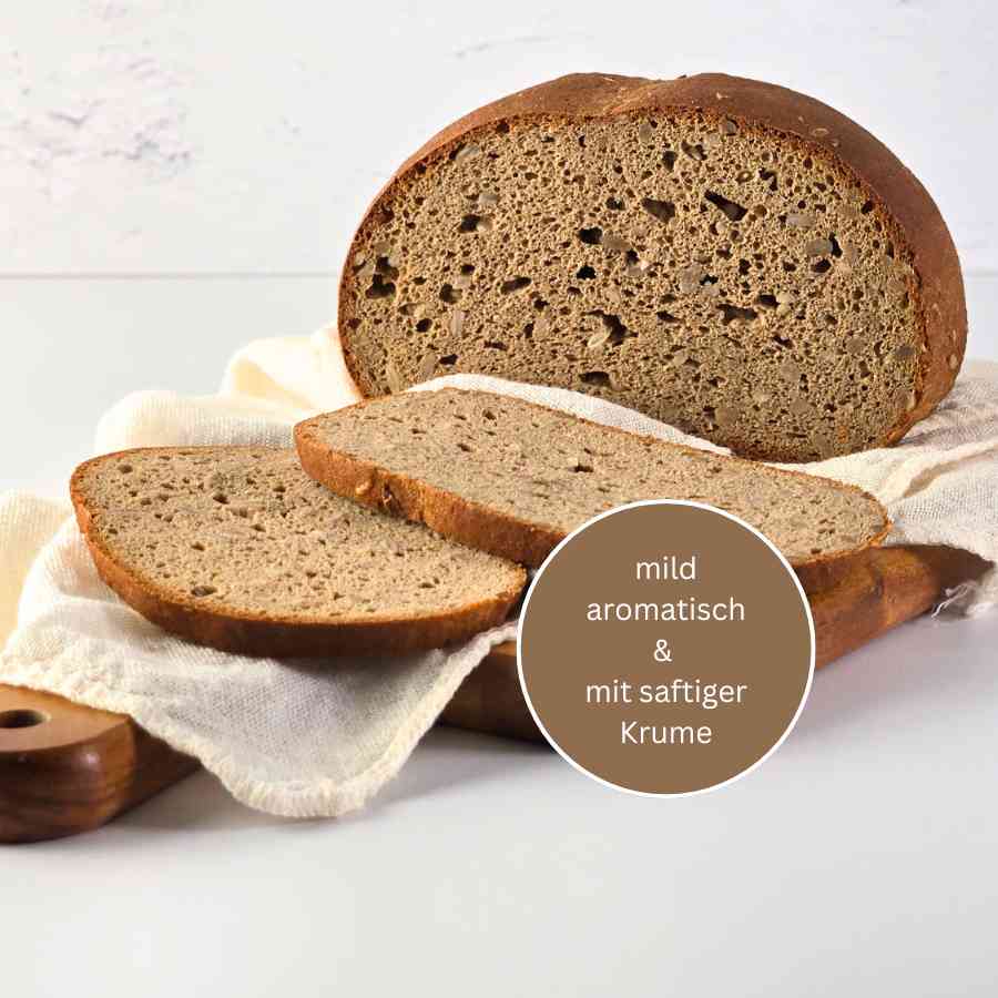 Ein herzhaftes, kerniges Landbrot, das geschmacklich an ein klassisches Roggenmischbrot mit Sonnenblumenkernen und an mildes Sauerteigbrot erinnert – natürlich ganz ohne Getreide und ohne Sauerteig.