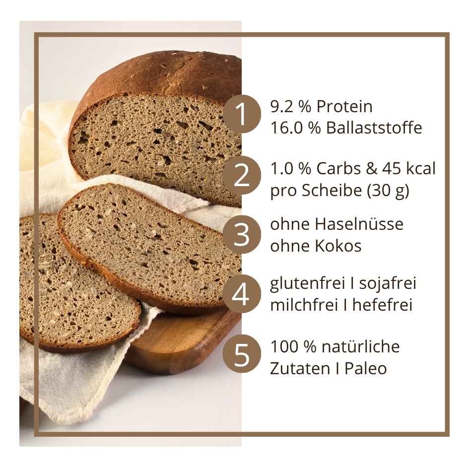 Ein herzhaftes, kerniges Landbrot, das geschmacklich an ein klassisches Roggenmischbrot mit Sonnenblumenkernen und an mildes Sauerteigbrot erinnert – natürlich ganz ohne Getreide, ohne Sauerteig, glutenfrei und keto.