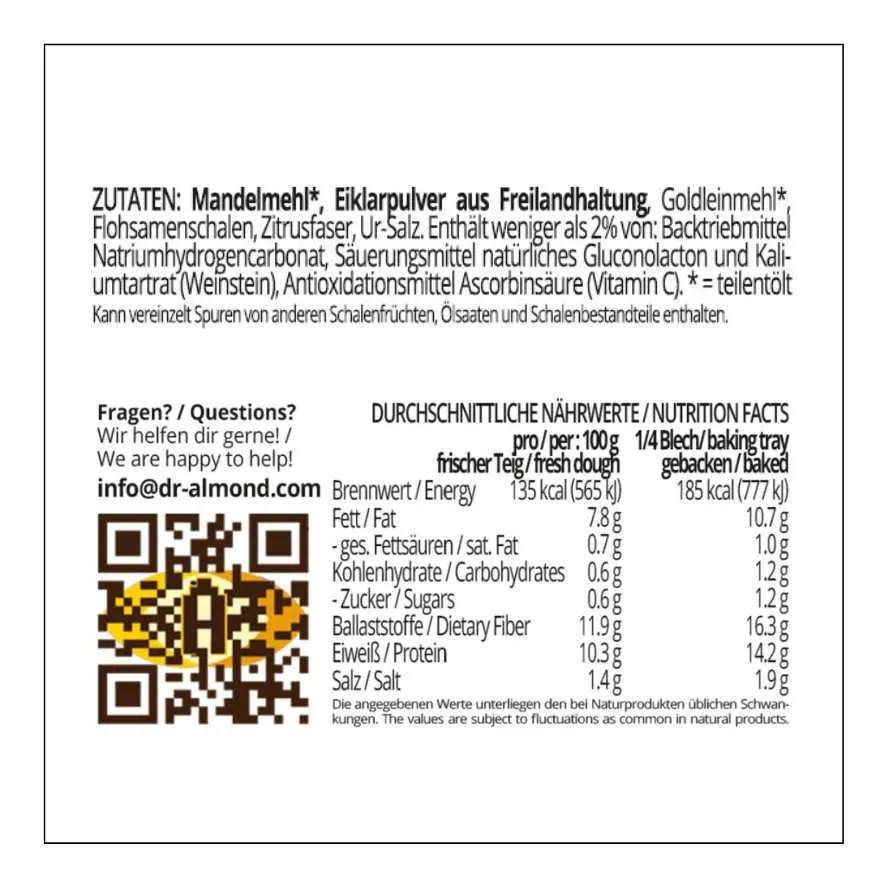 ZUTATEN: MANDELmehl, Goldleinmehl (teilentölt), EIKLARpulver aus Freilandhaltung, Flohsamenschalen, Zitrusfaser.