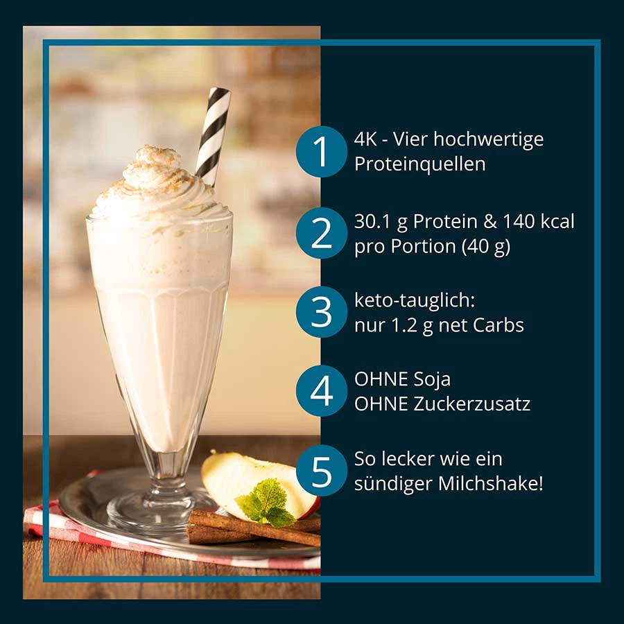 Die Kombination aus 4 hochwertigen Proteinen ist mit Sahnepulver, gefriergetrocknetem Apfelpulver aus 100 % Frucht und aromatischem Zimt verfeinert und mit unserer beliebten kalorienfreien Süßstoffkombination sowie unserer Zitrusfaser auf perfekten Geschmack und eine sahnig-sämige Konsistenz optimiert. Für das perfekte MILCHSHAKE-Erlebnis!