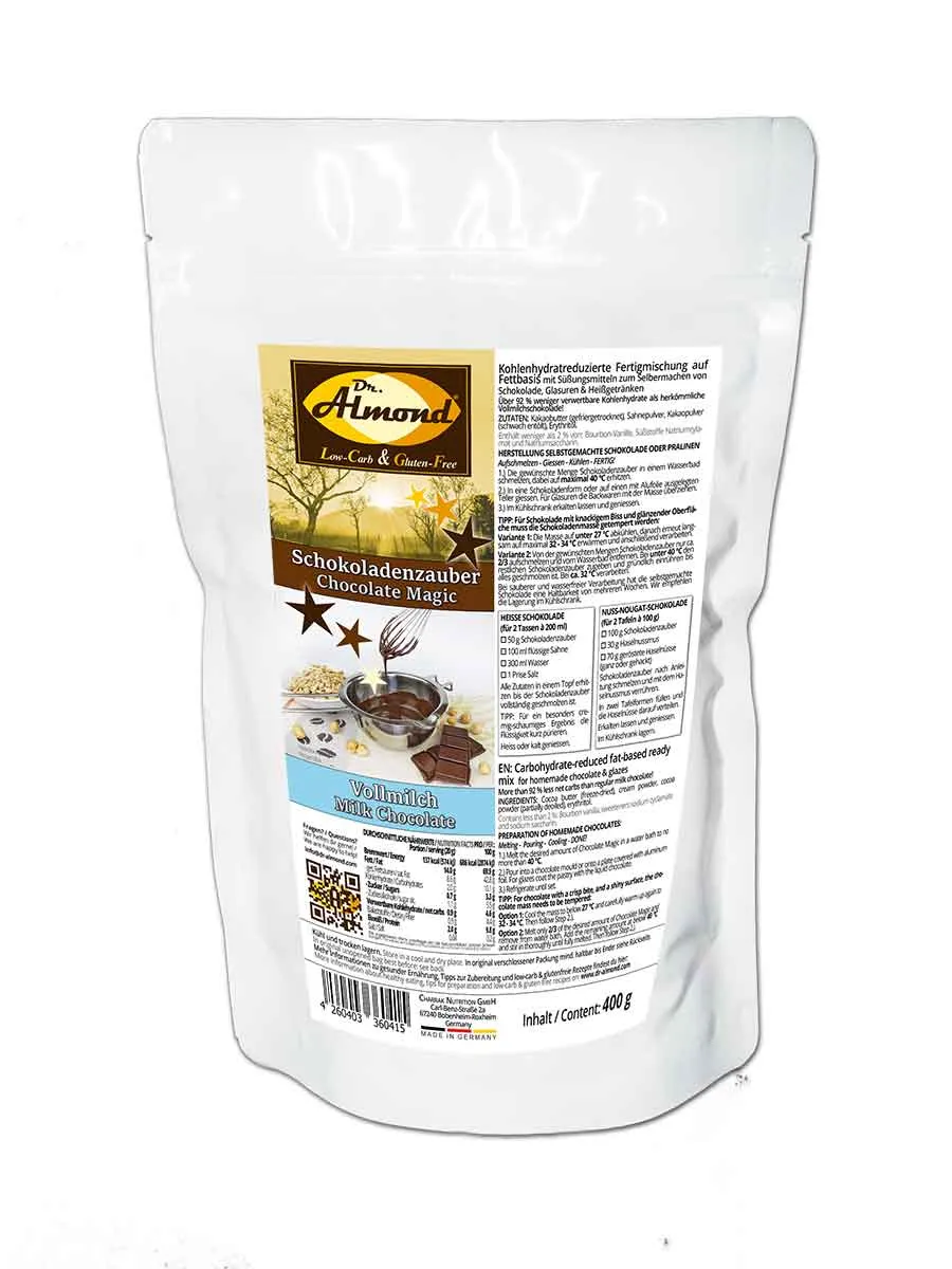 Eine noch einfachere Lösung für selbstgemachte Schokolade musste her – und hier ist sie nun! In unserem Schokoladenzauber haben wir dir alle Zutaten für köstliche low-carb Schokolade bereits in Pulverform vorgemischt: gefriergetrocknetes Kakaobutterpulver (ohne irgendwelche Zusätze!), aromatisches Kakaopulver, cremiges Sahnepulver und unsere bekannte low-carb Süße ergeben gemeinsam mit einem Hauch feinster Bourbon-Vanille eine fein abgestimmte, milde Vollmilchschokolade.
