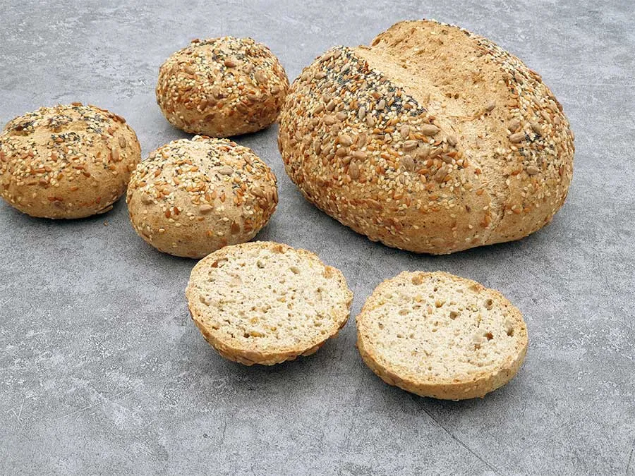 Ein mildes, helles Brot mit der klassischen Weltmeister-Körnermischung: knackige Sonnenblumenkerne, herzhafte Sesamkörner, milder Goldleinsamen und aromatischer, schonend geriebener Dampfmohn.
