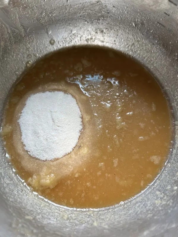 • Die Flüssigkeit von der Apfelmischung abgießen und die Menge bestimmen (z.B. 45g Flüssigkeit). Mit 1/3 dieser Menge (hier z.B. 15 g) Gelierfix unter Rühren kurz aufkochen.