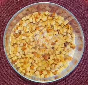 - Brotwürfel in eine Schüssel geben. Die Butter schmelzen und über die Brotwürfel gießen, umrühren und 15 Minuten ziehen lassen.