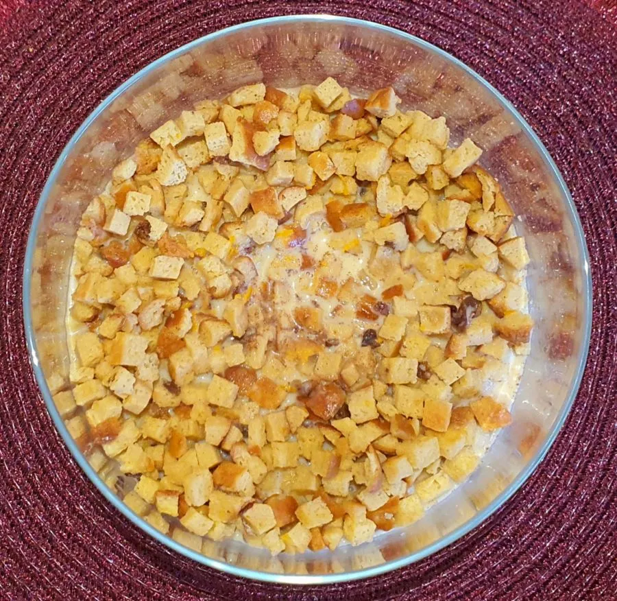 - Milch mit Eier und Süße verquirlen und leicht erwärmen, sollte nicht kochen. Zur warmen Milch Zimt, Tonkabohne, Pure Flavour und den Abrieb der Orange hinzufügen und umrühren. Die warme Ei-Milchmischung über die Brotwürfel gießen, umrühren und ca. 40 Minuten ziehen lassen. Immer wieder mal durchrühren.