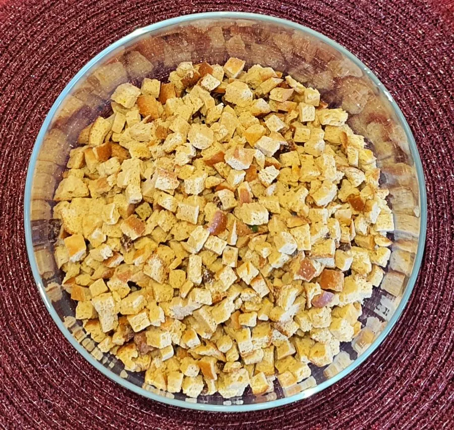 - Süßes Brot (Brioche, Reste aus Osterbrot, Punze etc.) klein würfelig schneiden und bei 70 Grad ca. 2h trocknen (Dörrautomat oder Backofen - hier Zeit ans eigene Gerät anpassen)