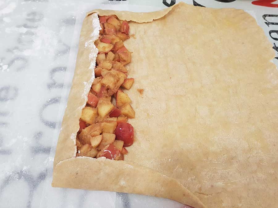 - Die Apfelmasse auf einer Seite des ausgerollten Teiges verteilen, dabei oben und unten und zur Seite ca. 3 cm Platz lassen. Den Teig vom Rand her um die Füllung umklappen, die Ober- und Unterseite hochklappen und den Strudel vorsichtig mit Hilfe des Backpapiers aufrollen.