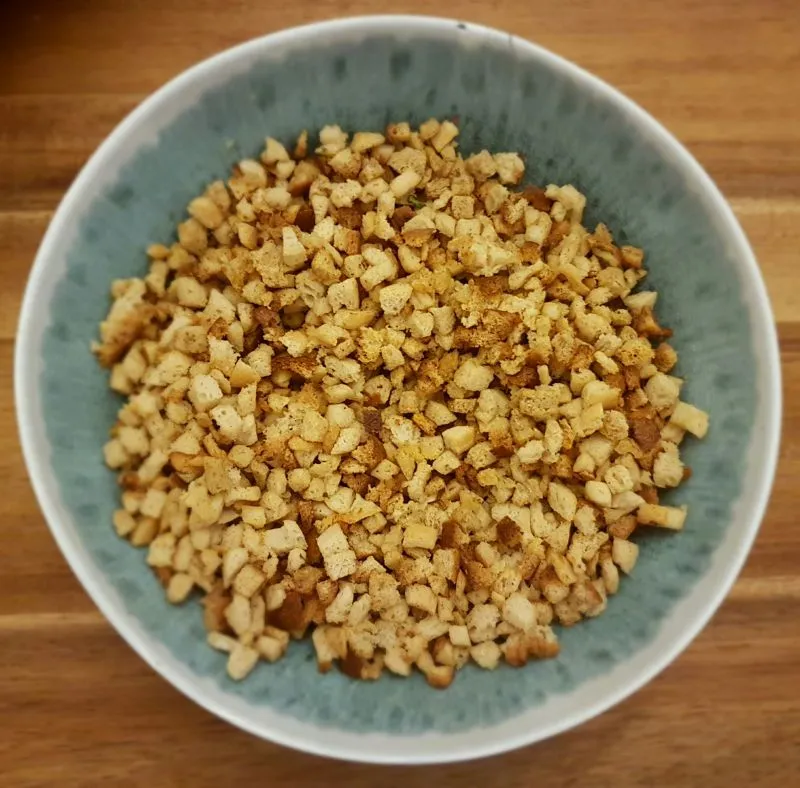 - 150 g Low Carb Brot kleingewürfelt (hier im Rezept Baguette & Ciabatta)
