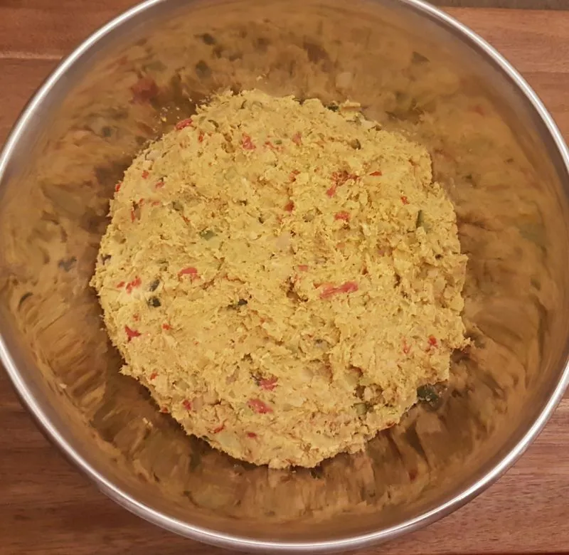 - Gemüse und Brotwürfel gut durchmischen. Die 3 Eier, die Gewürze, Cheddar und Creme Fraiche mit der Gemüsebrotmischung vermengen. Dann Zitrusfaser, Kuchenzauber und die geschmolzene Butter untermengen - am Besten mit den Händen, aber bitte nicht zu sehr kneten. Sollte der Teig zu weich sein, etwas Zitrusfaser nachgeben. Das Gleiche gilt beim Abschmecken - der Teig schmeckt roh schon lecker, einfach selbst nach Geschmack eventuell nachwürzen. Für 2 Stunden im Kühlschrank durchziehen lassen.