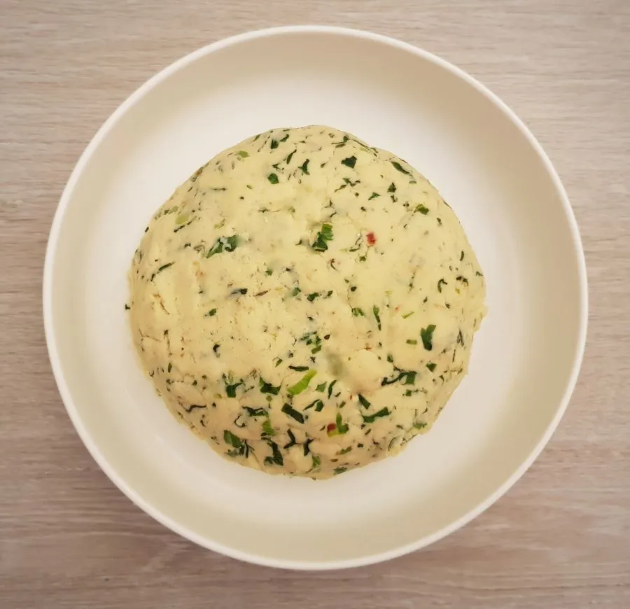 - Bärlauch in etwas Ghee kurz anbraten und zu Seite stellen. Eine Schüssel vorbereiten und alle Zutaten incl. Bärlauch hinzufügen und einen gleichmäßigen Teig kneten. Funktioniert am Besten mit den Händen.