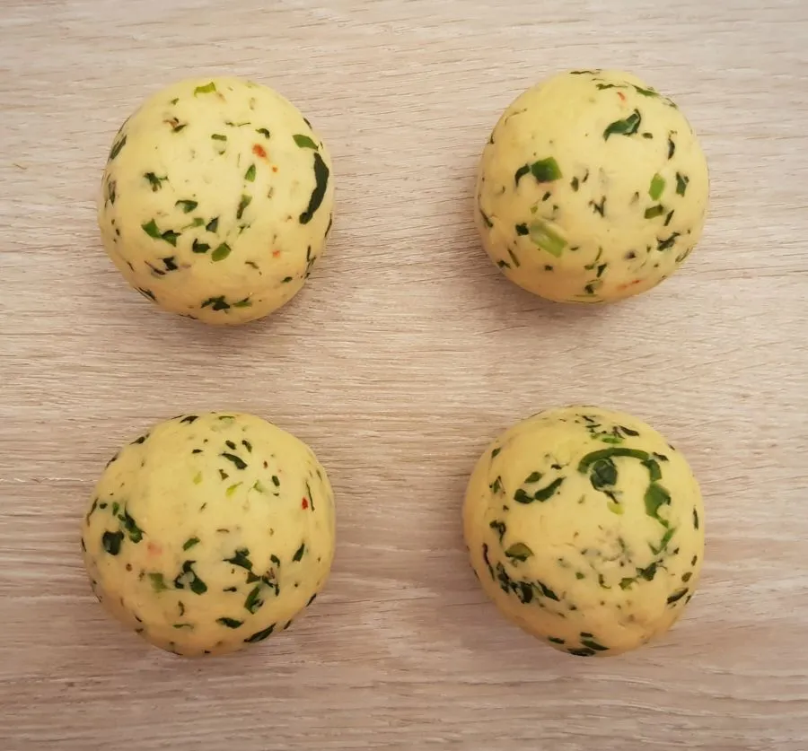 - Aus der Masse Knödel zu je 60g formen. Ergibt 14 Stück.