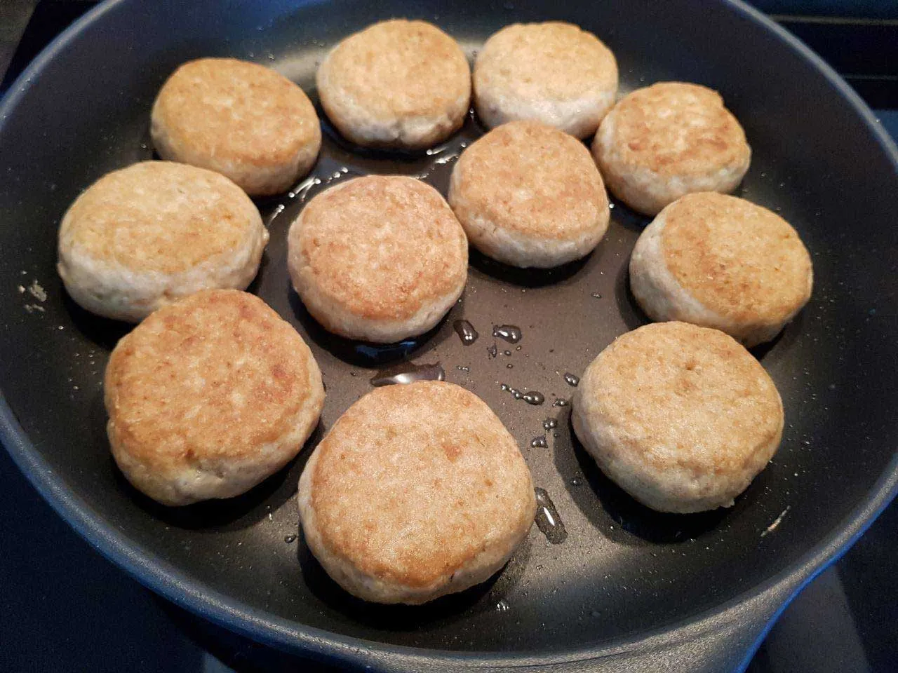 • in 2 EL Ghee bei niedriger bis mittlerer Hitze von beiden Seiten goldbraun backen (dauert ca. 20 min, dabei wirklich OFT wenden damit sie nicht zu dunkel werden)