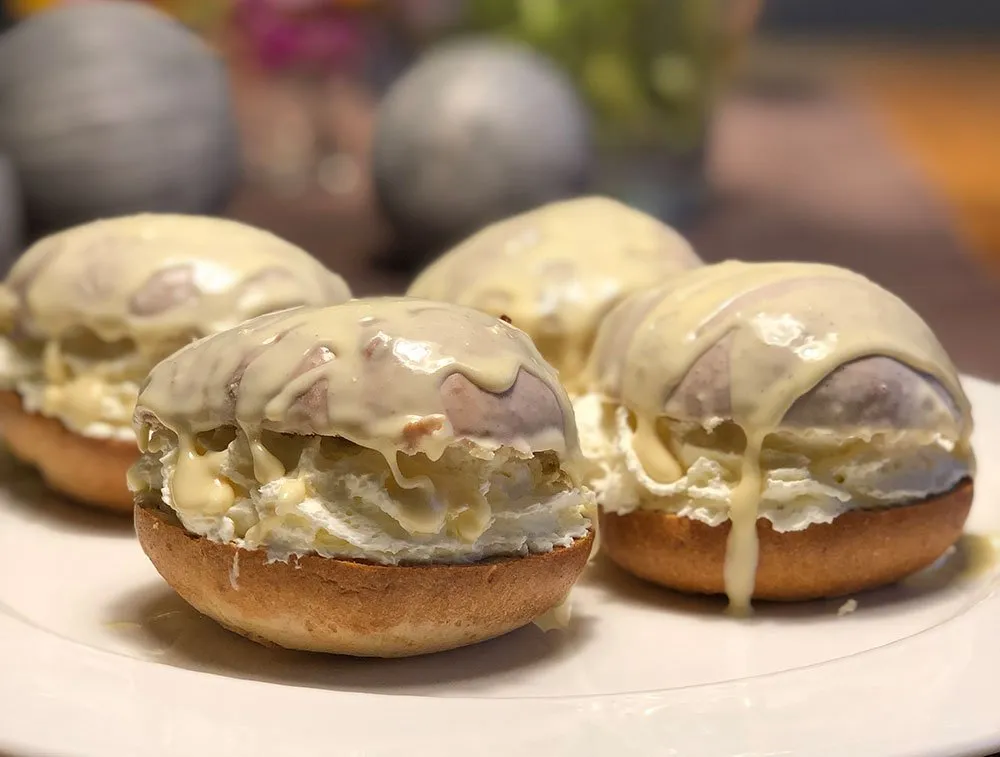 - Die fertig gebackenen Berliner auf einem Gitter auskühlen lassen. Aufschneiden und nach Belieben füllen und dekorieren.