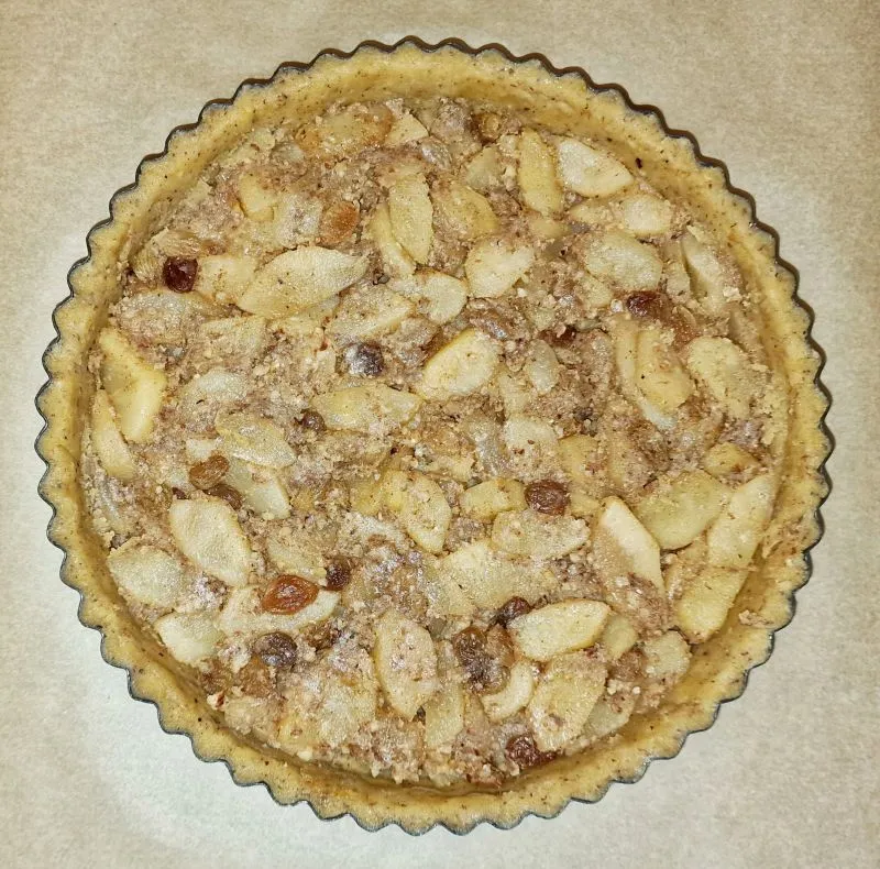 - Den Teigboden einstechen, dann die Birnenmasse gleichmäßig verteilen und mit der Rückseite eines Löffels die Masse andrücken.