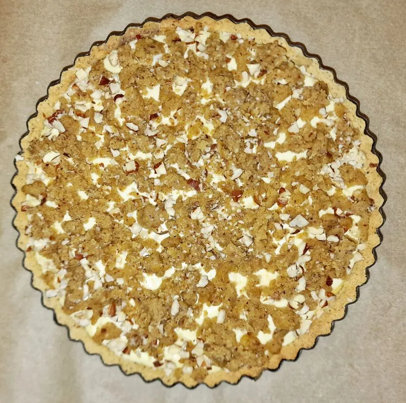 Tarte mit Nussboden, Streuseln und einer Cheesecakemasse mit Birnen. Pro Stück nur 12g Kohlenhydrate.