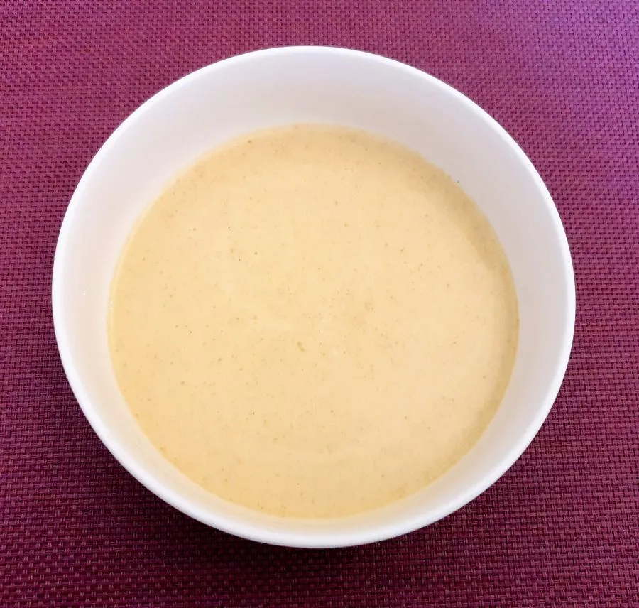 - Die Restmilch abgießen, die in der Schüssel mit den Brotscheiben übrig ist. In die Milch die 20g Pfannkuchenmischung unterrühren.