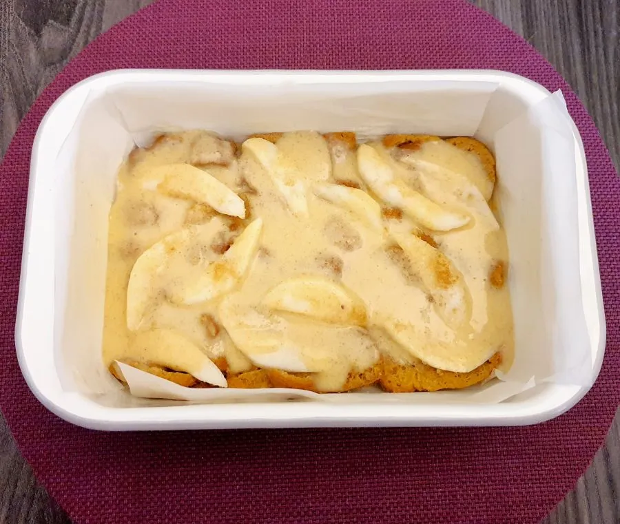 - Fertig gebackenes Brioche in Scheiben schneiden und in eine große Schüssel legen. In einer anderen Schüssel Milch, Eier, Low Carb Kristallin, Vanilletraum, Zimt, Pure Flavour gut miteinander vermischen, über die Briochescheiben gießen und ziehen lassen.