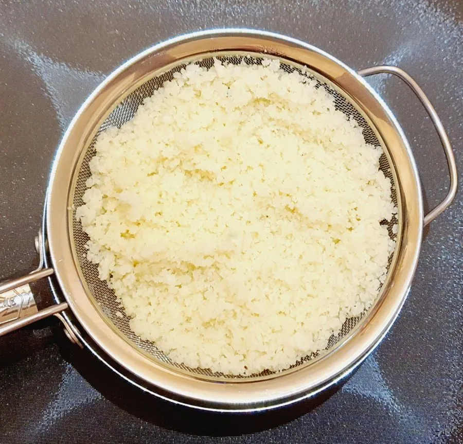 • Den zerkleinerten Blumenkohl in etwas Wasser weich dünsten. Dauert ca. 8 - 10 Minuten. Dann in einem Sieb abseihen und gut abtropfen lassen.