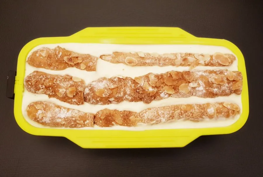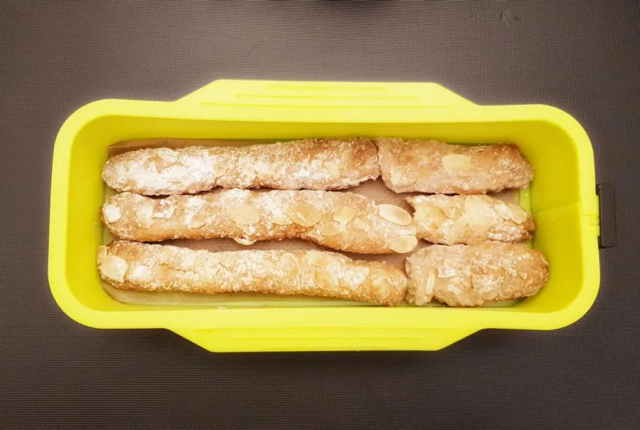 - Die Brandteigstangen in die Backform legen, bei Bedarf kürzen - Boden sollte bedeckt sein! Dann mit Creme auffüllen und die Backform an der Tischkante etwas aufklopfen, so verteilt sich die Creme gleichmäßig.