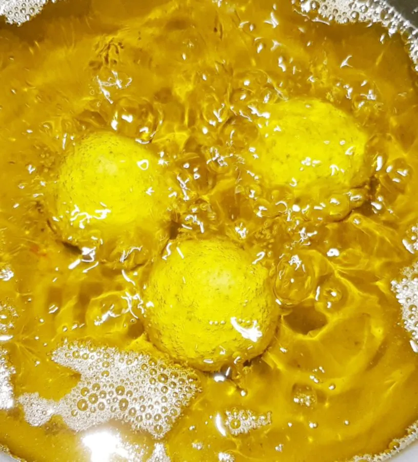 - In einer Mischung aus Rapsöl und Sonnenblumenöl für 8 Minuten frittieren, auf einem Küchentuch abtropfen lassen und auf ein Gitter setzen. Danach für 10 Minuten bei 180 Grad fertig im Backrohr backen.