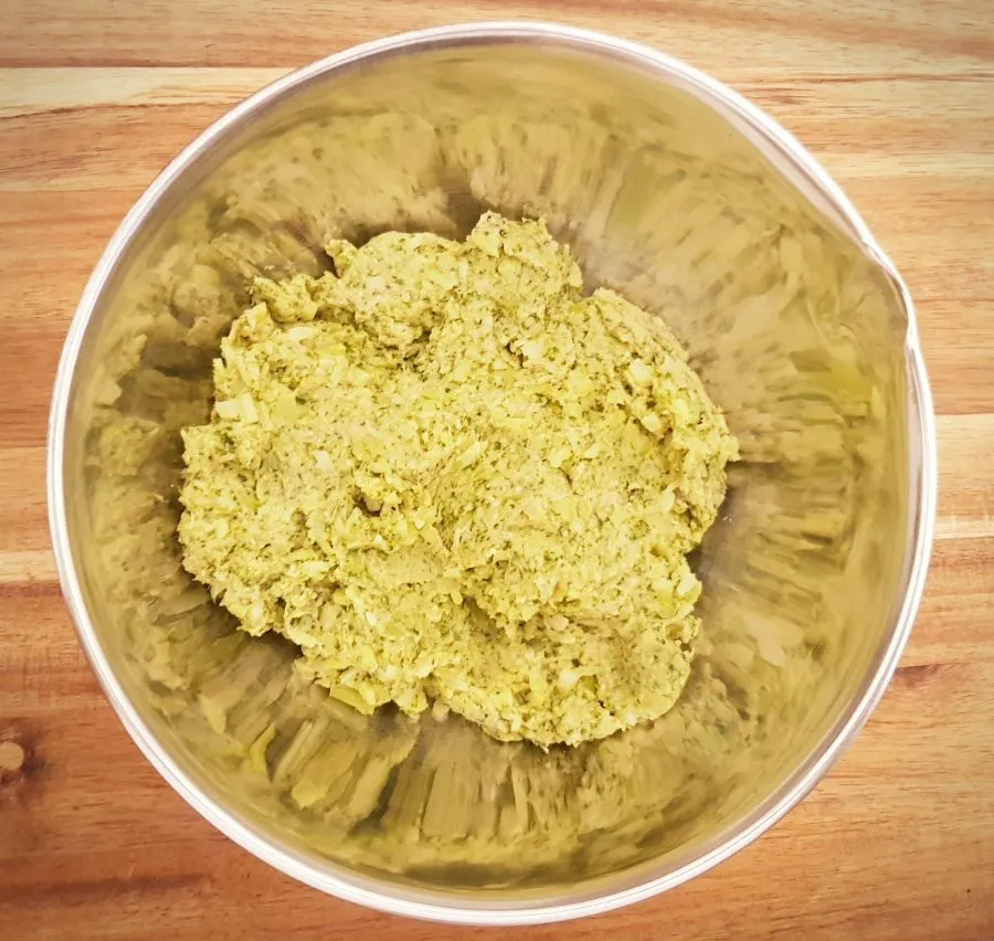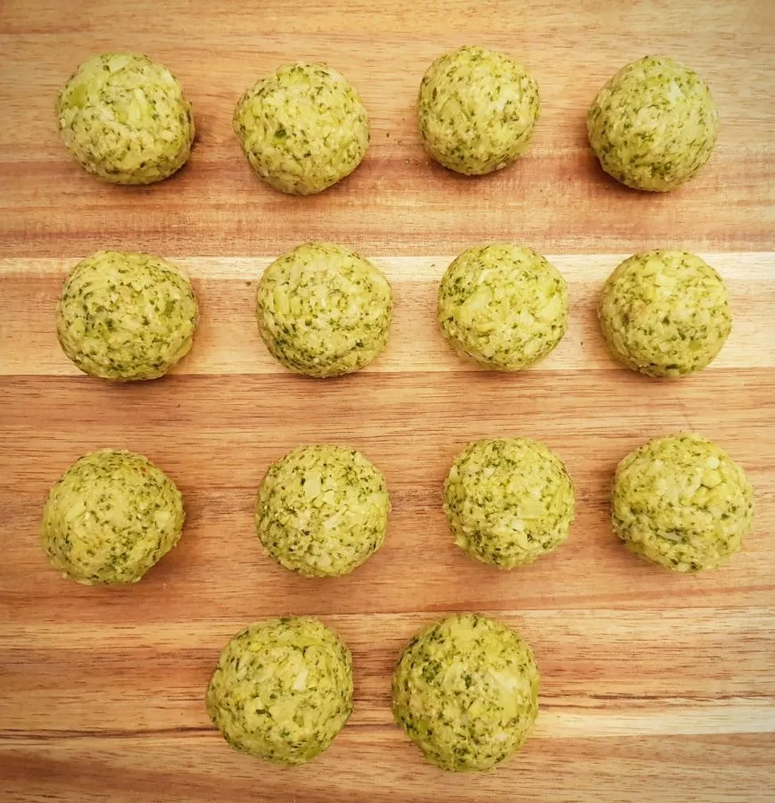 - Je ca. 40g Broccolimasse in der Handfläche flachdrücken und mittig ein Mozarellabällchen setzen. Komplett verschließen und in der Toastbrotmischung wälzen. Wiederholen bis die Masse verbraucht ist.