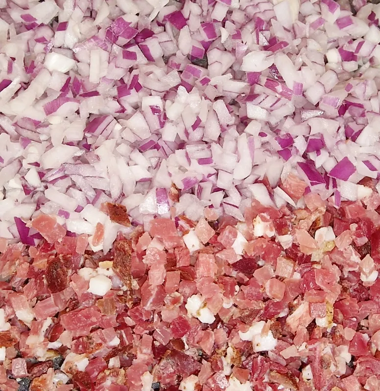 - Zwiebel und Bauernschinken klein schneiden.