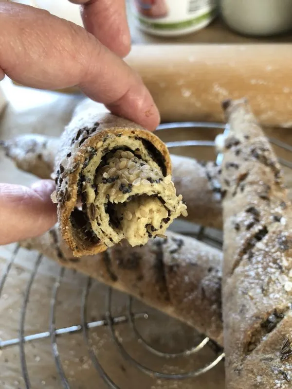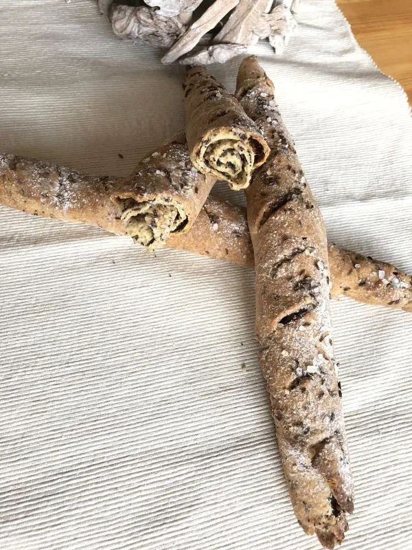 • Die Stangerl nun aus Ofen nehmen und nach Belieben mit einem Hauch Bambusfaser bestäuben - siehe Bild der fertigen Stangerl. So entsteht eine sehr rustikale Optik.