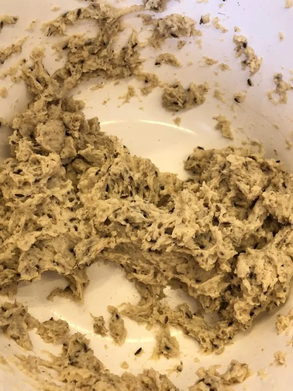 • Die Butter schmelzen und zusammen mit dem Wasser und den vorher hinzugefügten Gewürzen mit der Backmischung zu einem glatten Teig verrühren.