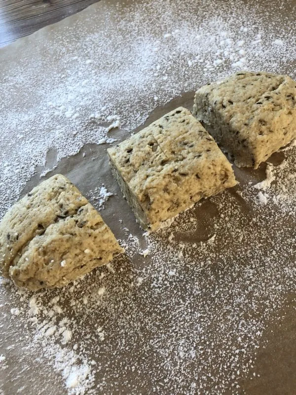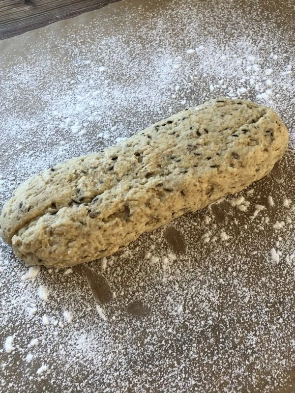 • Den Teig zu einer dicken Rolle formen (siehe Bild) und in 3 Teile teilen. Willst Du kleinere Stangerl, kannst Du auch 6 Teile daraus machen.