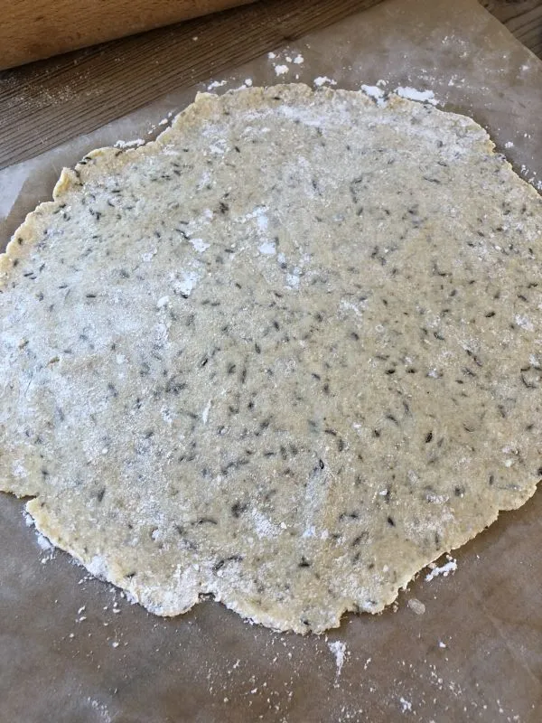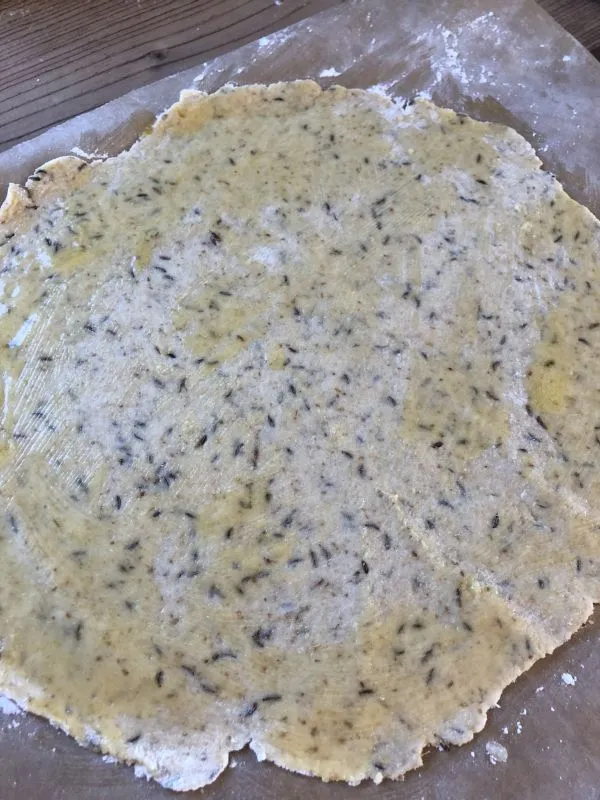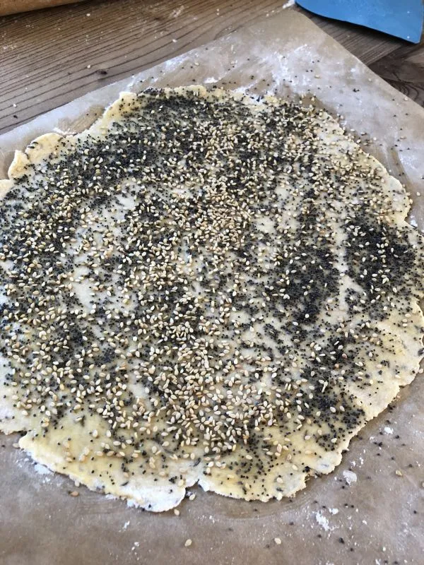 • Den ausgerollten Teig mit geschmolzener Butter bepinseln und mit Mohn und Sesam bestreuen.
