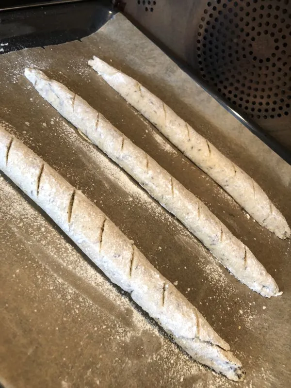 • Die Teigplatte nun fest zusammenrollen. Sind alle fertig gerollt, die Stangerl auf ein mit Backpapier ausgelegtes Blech legen. Mit einem scharfen Messer mehrmals quer einschneiden.