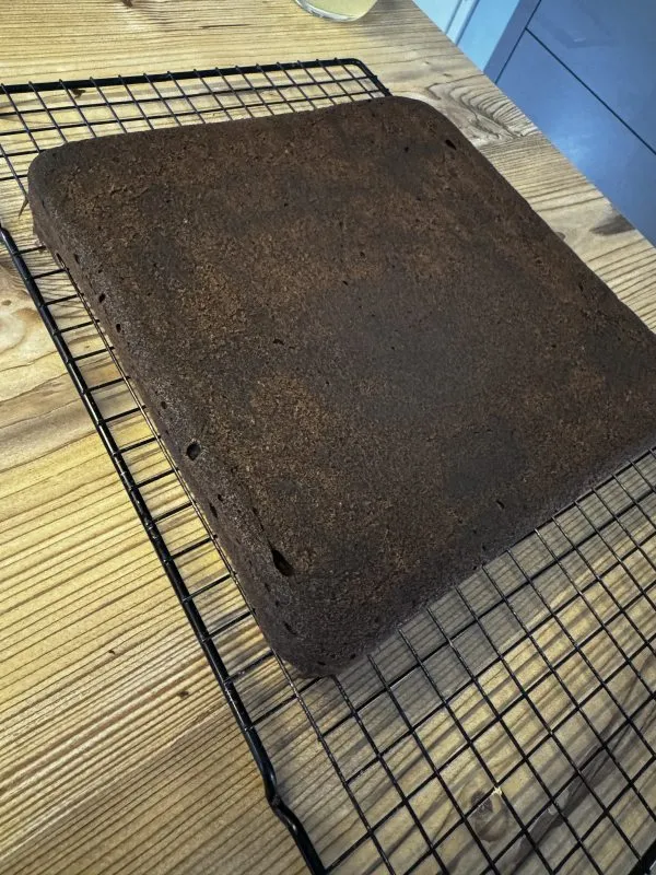 - Teigplatte kurz etwas auskühlen lassen (10 Min) und dann zum vollständigen Erkalten auf ein Gitter geben.