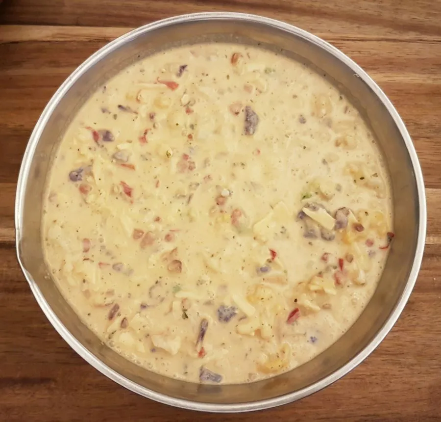 - In der Zwischenzeit Eier mit Milch und Creme Fraiche vermengen. Zitrusfaser und Kuchenzauber untermengen. Die Speckmischung, Käse und Blumenkohl unterheben. Teig salzen und pfeffern, kosten ob Gewürz passt.