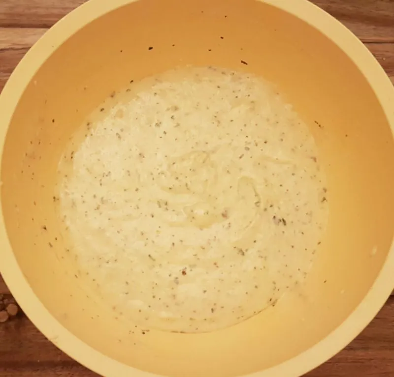 - In der Zwischenzeit Petersilie und Schnittlauch klein schneiden, Eigelb mit Gewürzen, Frischkäse, Abrieb der Zitrone (Saft wird später benötigt), geriebenem Cheddar und dem Paniermehl vermengen und in den Kühlschrank stellen.