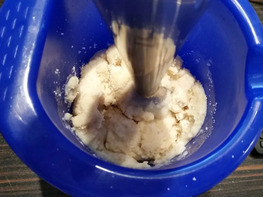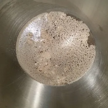 • Die 200 g Backmischung mit Stollengewürz mischen, zur Hefelösung geben (beim Mandelbrioche kommen noch zusätzlich Eier in den Teig, siehe Packung!) und so lange rühren, bis ein gleichmäßiger Teig entstanden ist.