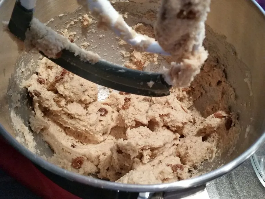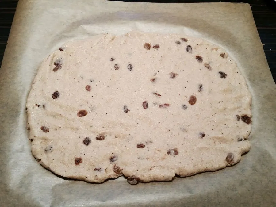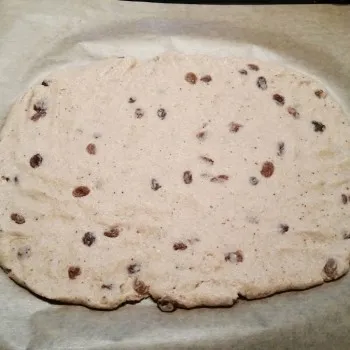 • Die Hefe mit den Rosinen (oder wenn ohne Rosinen: ¼ TL Zucker oder Honig) in 400 ml (bzw. die auf der Packung angegebene Menge) lauwarmem Wasser verrühren und ca. 30 Minuten an einem warmen Ort ruhen lassen.Den Backofen auf 175 °C vorheizen.