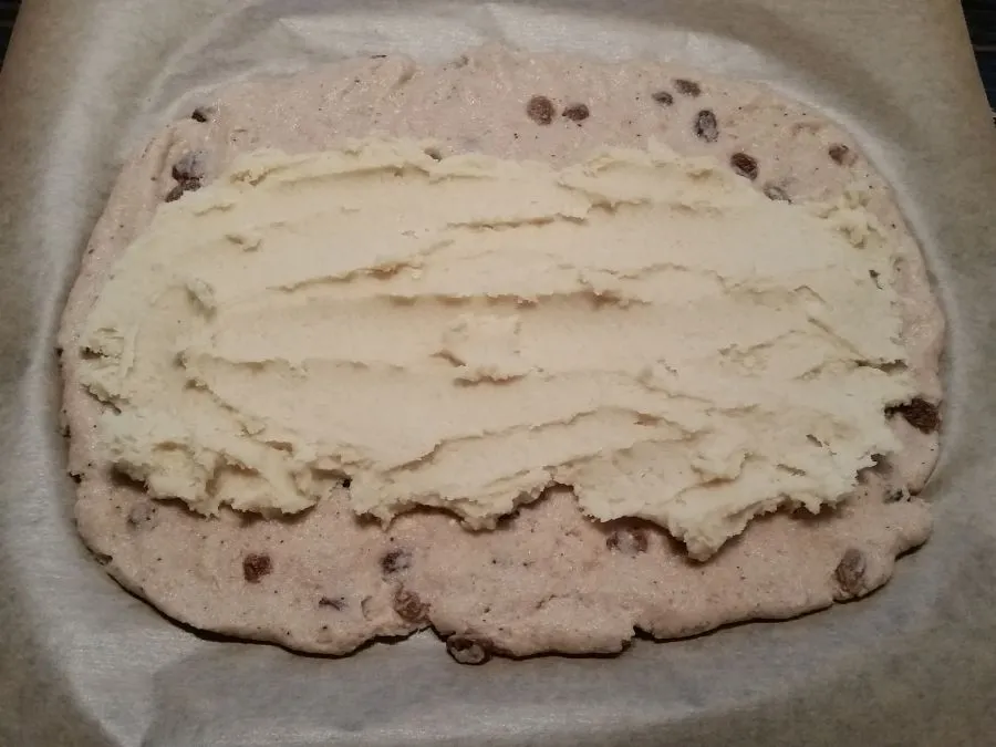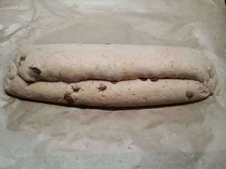 • Den Teig mit feuchten Händen auf Backpapier ausrollen, mit der Füllung bestreichen und dabei ca. 3 cm auf der Längsseite aussparen. Anschließend den Teig von beiden Seiten einklappen und danach eine der Seiten über die Mitte falten. Die Enden des Stollens gut verschließen. Evtl. mit Butter bestreichen und mit Mandelblättchen überziehen.
