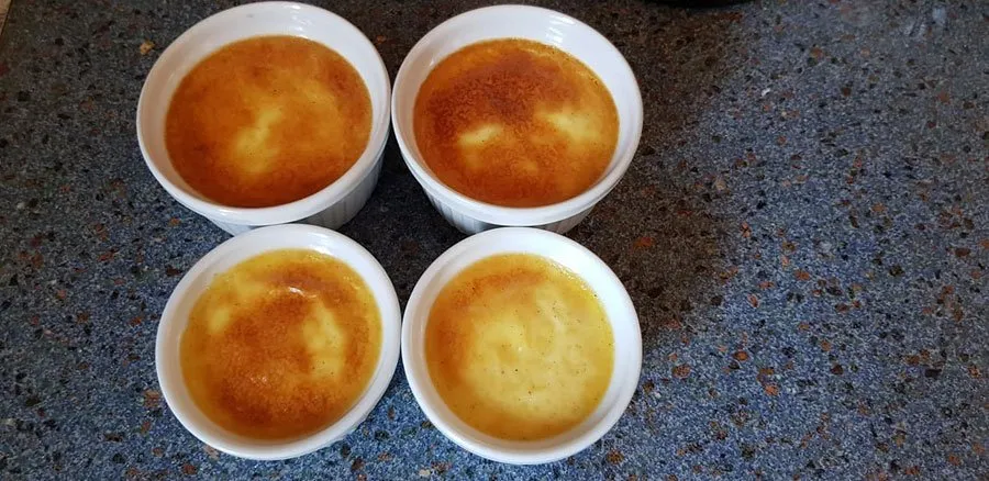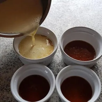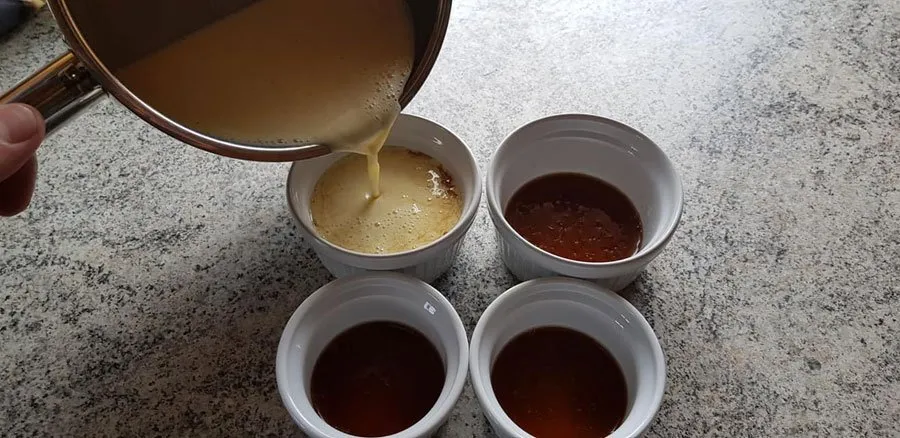 - Die Karamellsauce in feuerfeste Schälchen auf max. 1 cm Höhe befüllen. Dann eine Fettpfanne mit Wasser füllen (worin später die Schälchen zu zwei Drittel bedeckt stehen sollten). Backofen auf 150 °C auf Ober- und Unterhitze vorheizen.