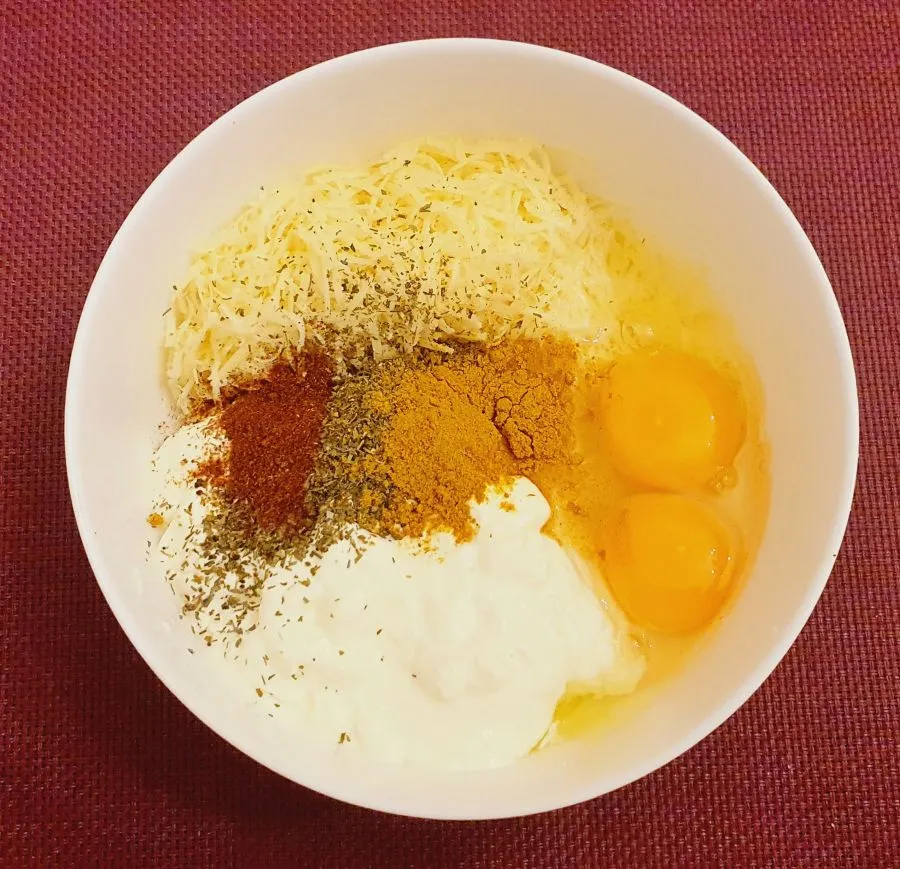 - Für den Guss Frischkäse, Eier, Zitrusfaser und Milch glattrühren, geriebenen Käse und Gewürze unterheben und nach Geschmack würzen. Nach Belieben nachwürzen.