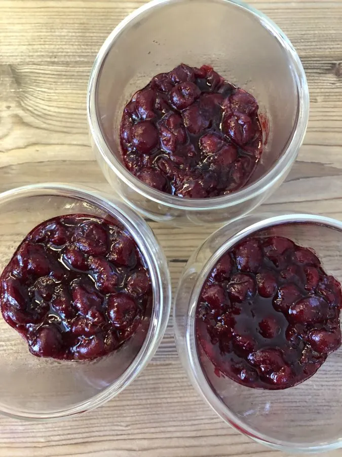 - Nun das Dessert schichten: Ganz unten etwas zerbröselte Kekse - diese mit je 1 EL Kirschwasser tränken. Danach 1/6 der noch warmen Kirschmasse darauf geben. In den Kühlschrank stellen, bis vollkommen abgekühlt.