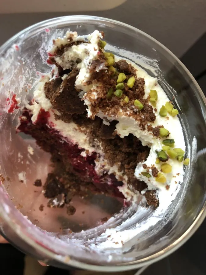 - Nun den Rest der Sahne darauf verteilen und nach Belieben mit Keksen, Schokolade und Pistazien dekorieren.