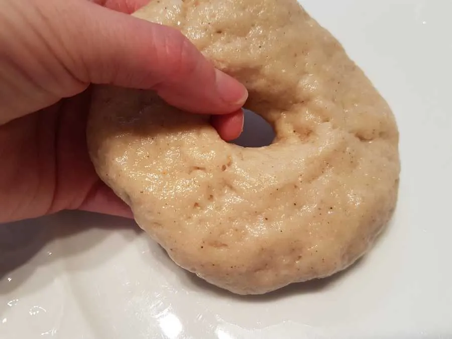 - Den Hefeteig laut Packungsanleitung der Mini-Berliner mit Hefe zubereiten. Aus dem Teig 4 - 6 Donuts formen. Das geht besonders einfach, wenn du zunächst die Teigklumpen zu Knödeln formst, diese etwas platt drückst und mit dem Finger ein Loch in die Mitte stichst. Anschließend weitest du das Loch gleichmäßig rundherum aus (s. Photo). Die Teiglinge anschließend 45 Minuten offen ruhen lassen.